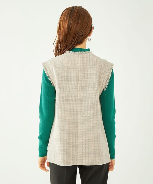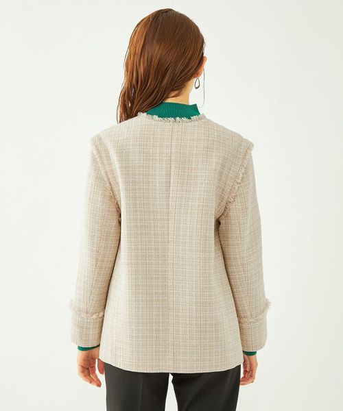 切り替えのアームホール部分や襟や袖に施したフリンジがポイント。