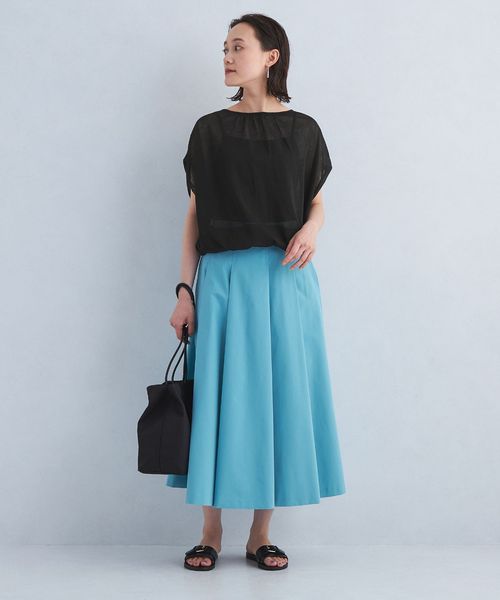 ボリューム感のあるシルエットのスカートを合わせた大人フェミニンな着こなしがおすすめです。