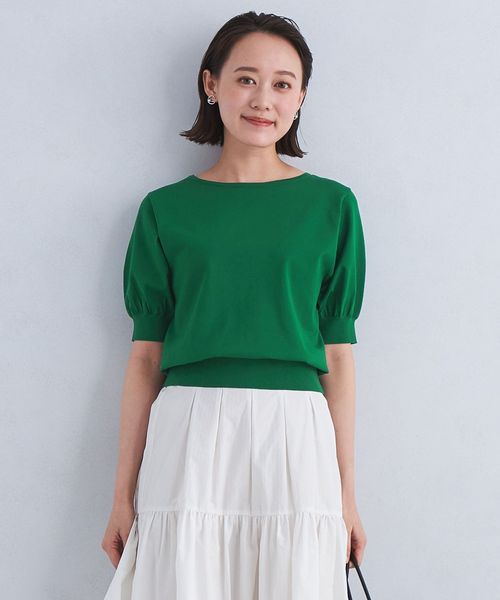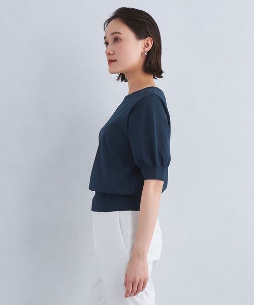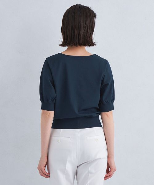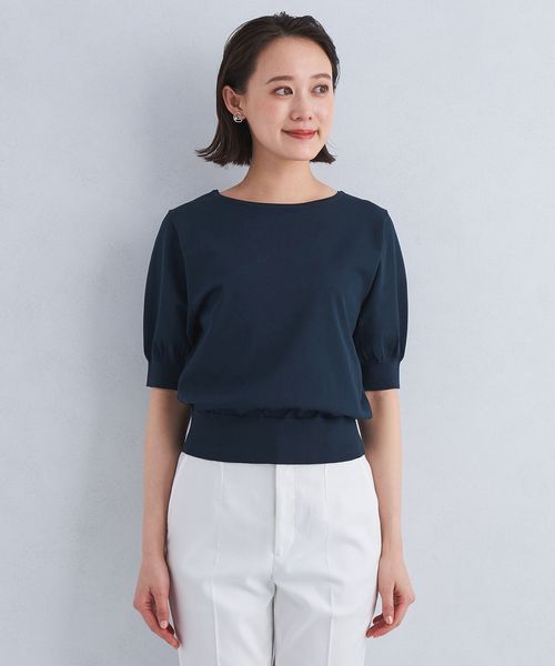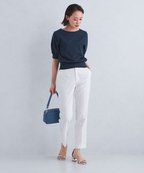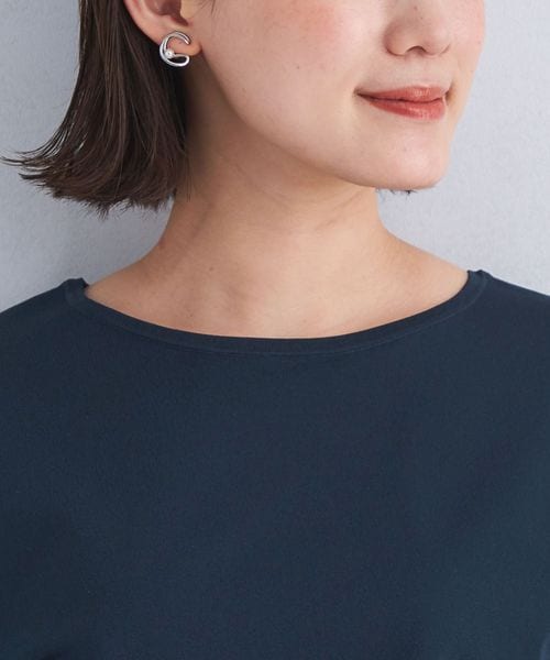 顔まわりがすっきりとみえるボートネックのデザインもポイント。