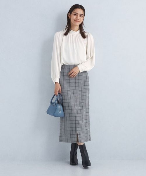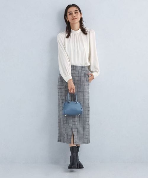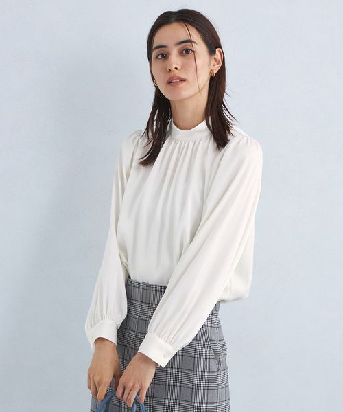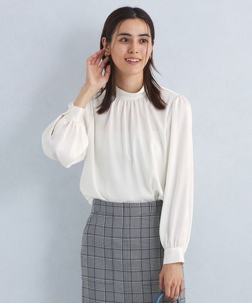 すっきりと上品な印象のスタンドカラーブラウス。