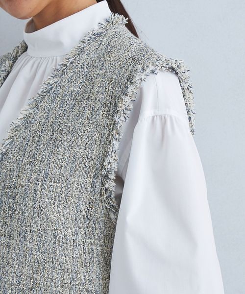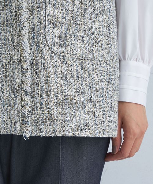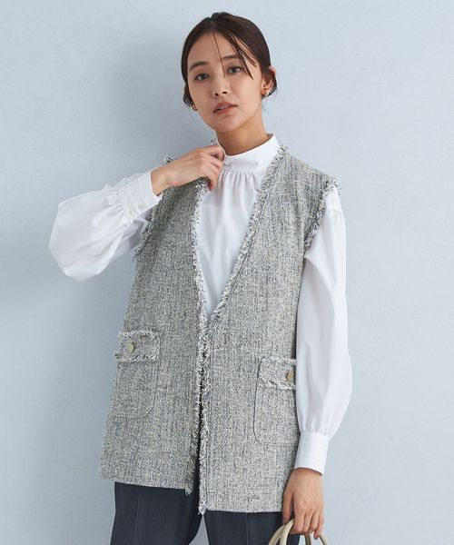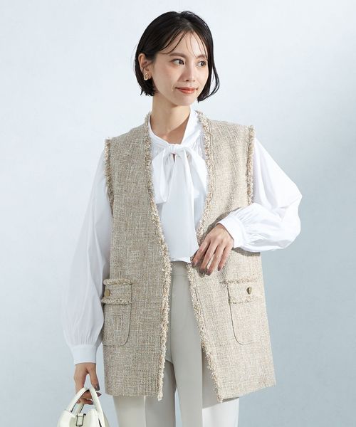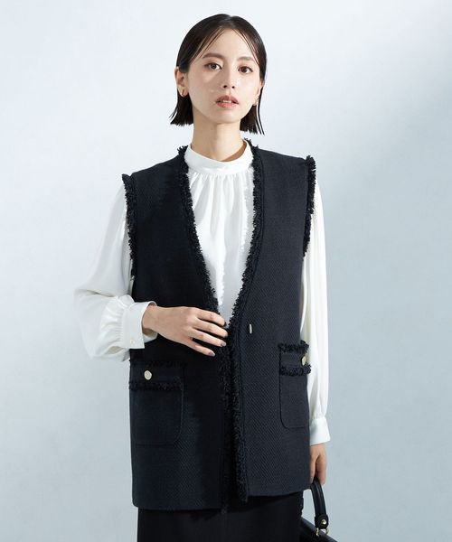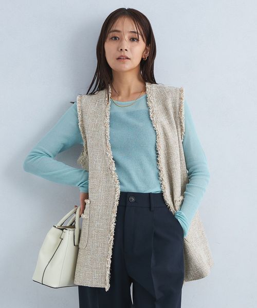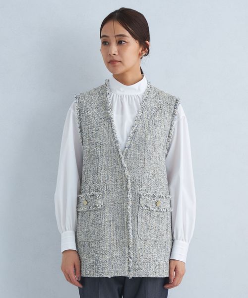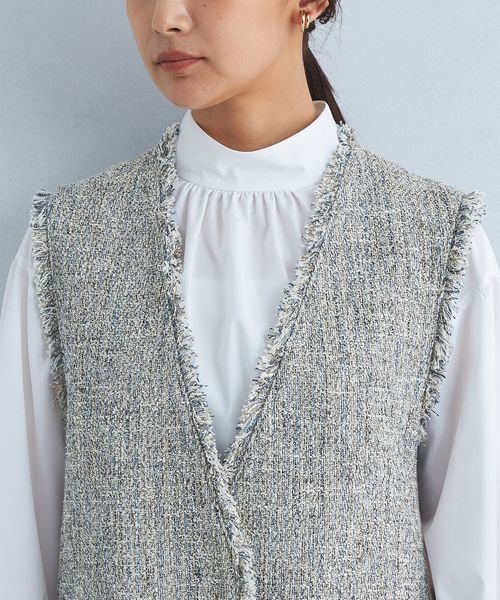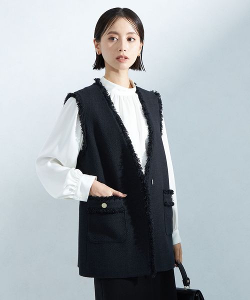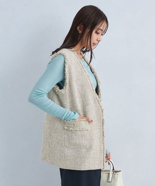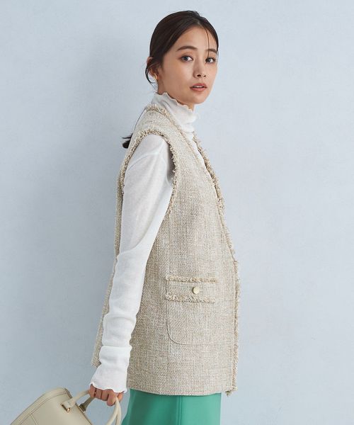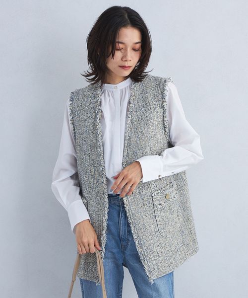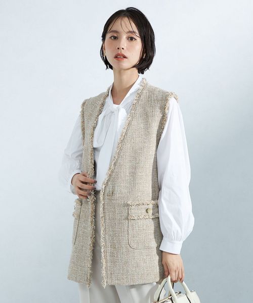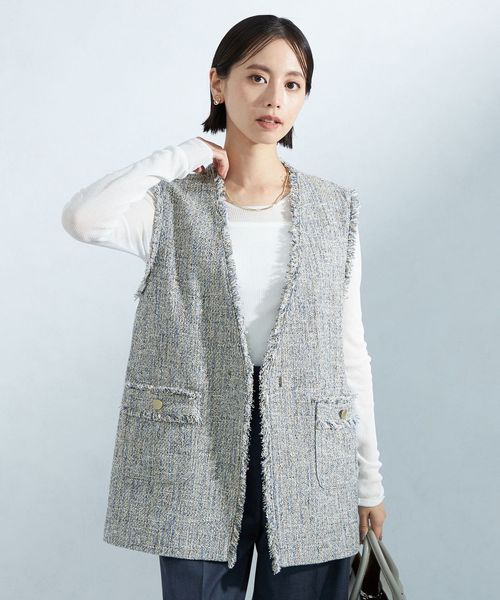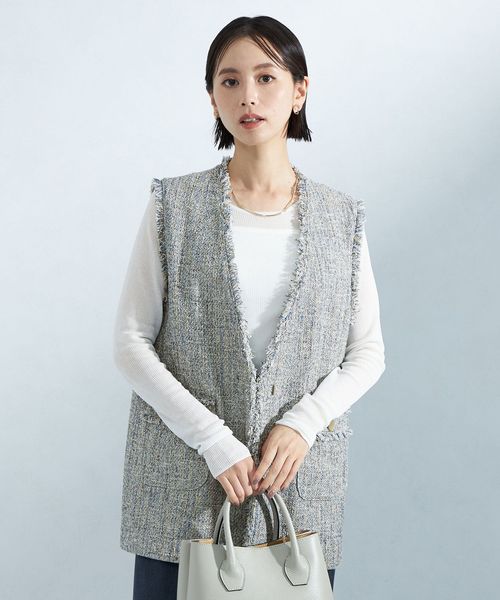 華やかなツイードライクな素材×フリンジが目を惹くジレ