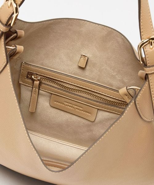中央のベルトは飾りとなるので垂らすデザインで固定はできませんが、バッグの口が開くのをカバーしてくれます。