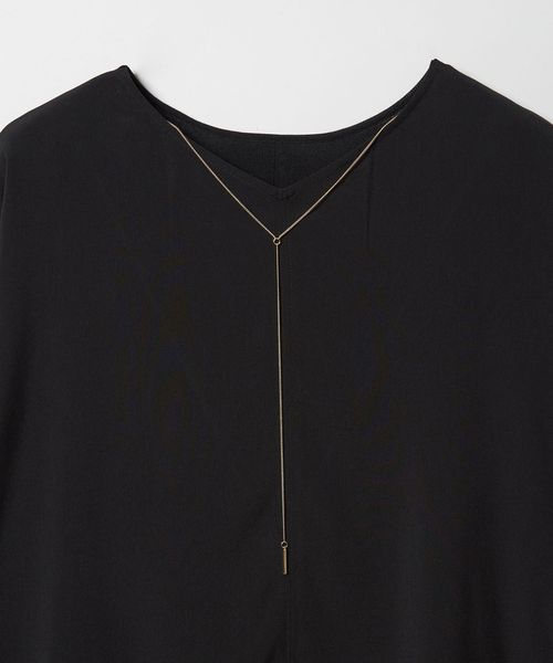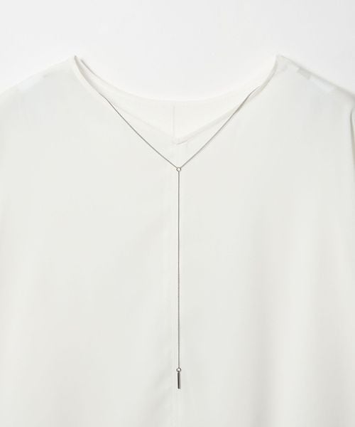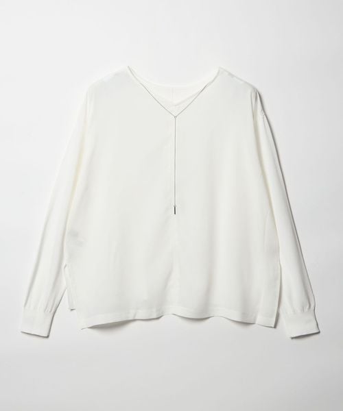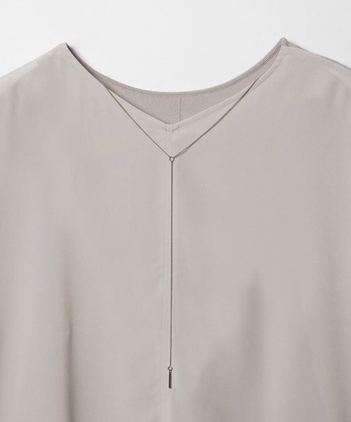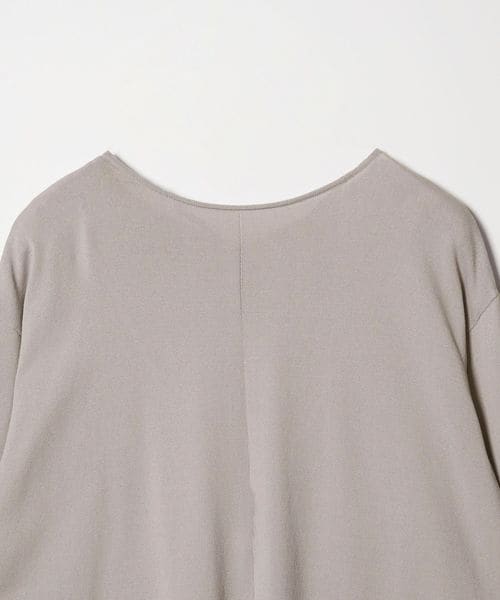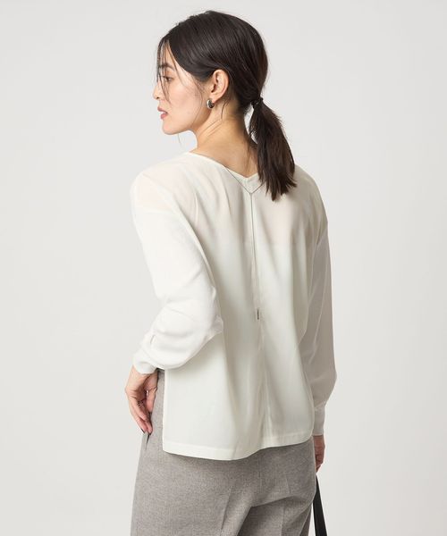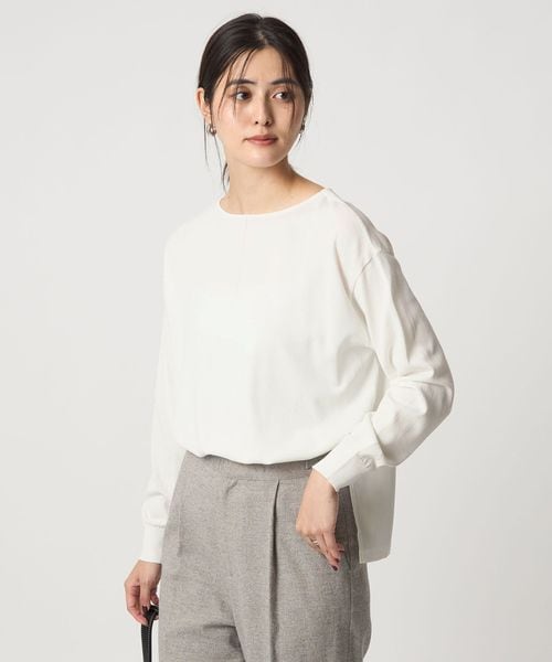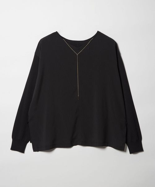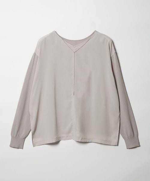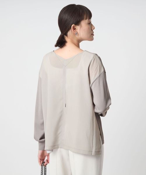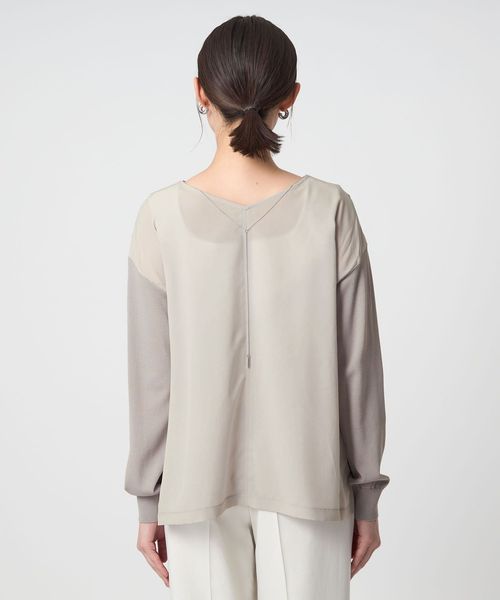 前身頃はニット素材、後ろ身頃と肩部分にはシアー感のあるさらりとしたタッチの素材をドッキングしたデザインの一着。