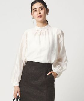 フェイクパール×スタンドネックデザインがポイントのブラウス。