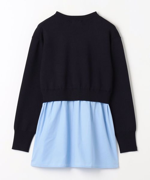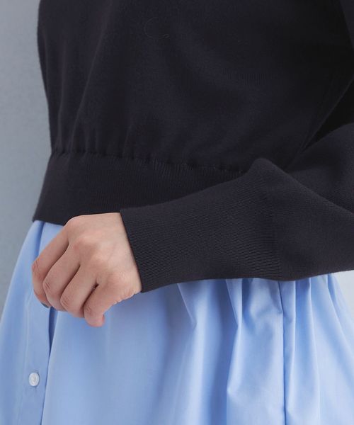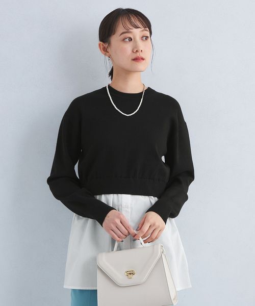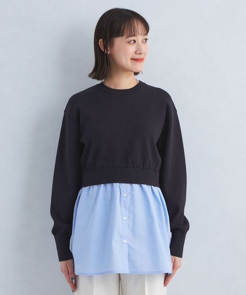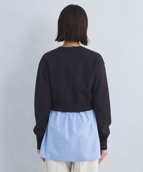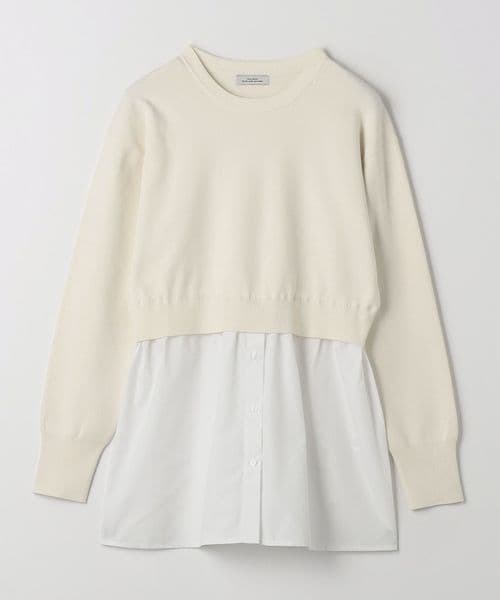 クロップド丈のニットに、シャツをレイヤードしているような見え方のドッキングプルオーバ―。