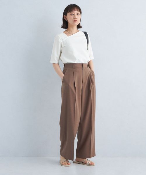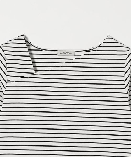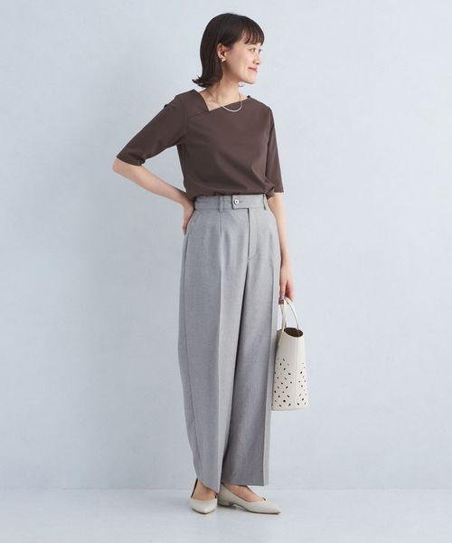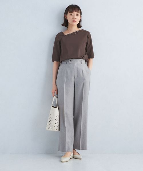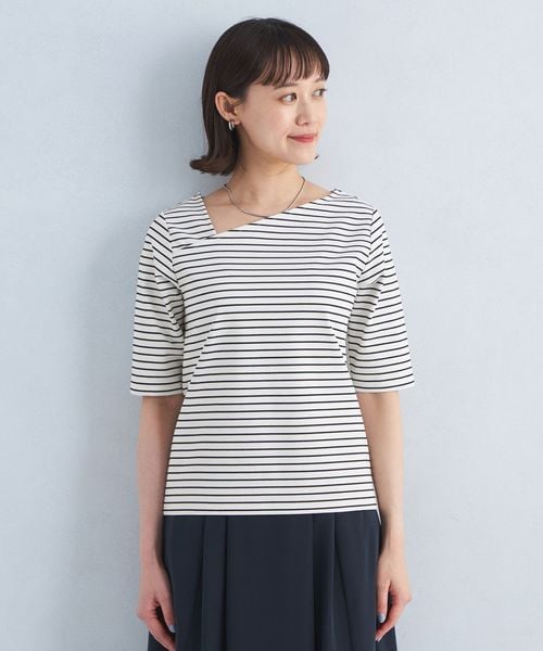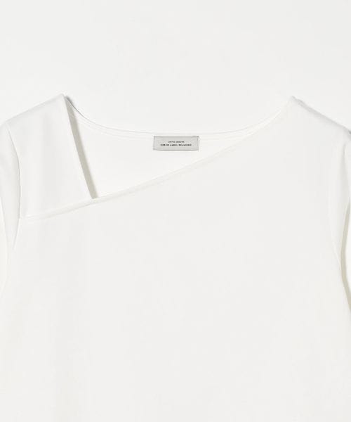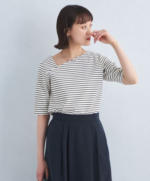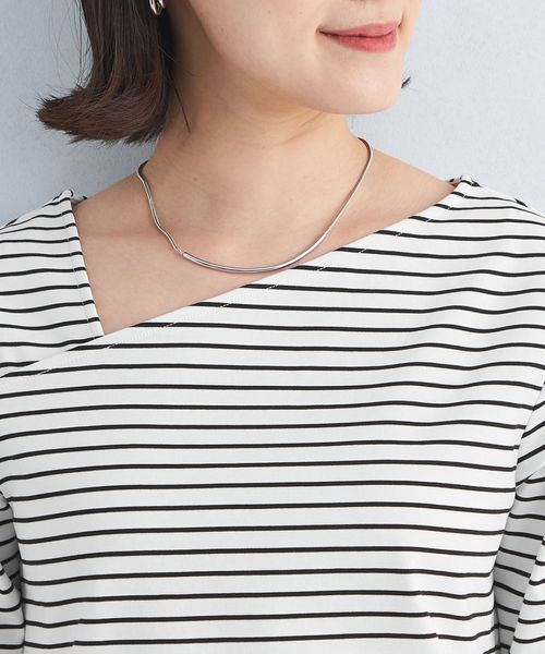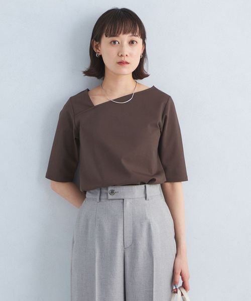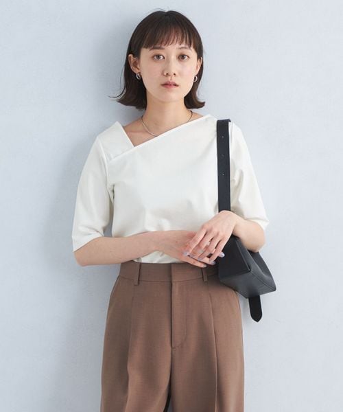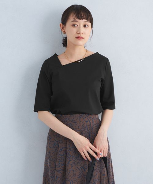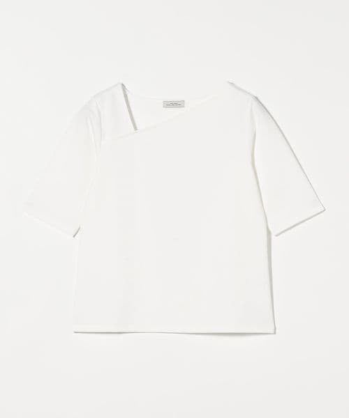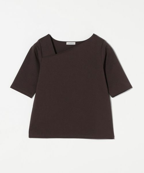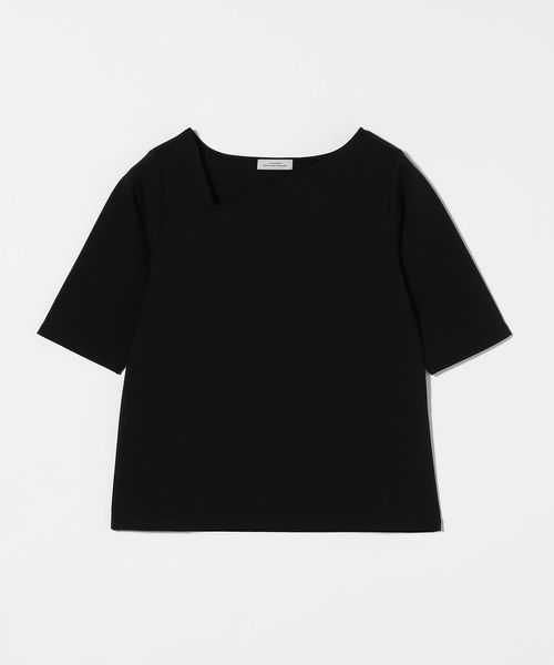 シャープな印象のアシンメトリーネックがポイントのカットソー。