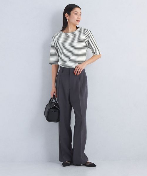 アウターから見えるシャープなボートネックがコーディネートを引き締めてくれます。