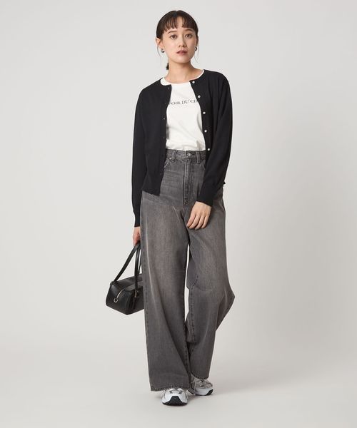 フロントのフェイクパール調ボタンがアクセントになった一着です。