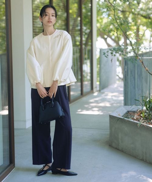 大胆なボリュームのある袖デザイン、身頃のペプラムシルエットが大人フェミニンな雰囲気。