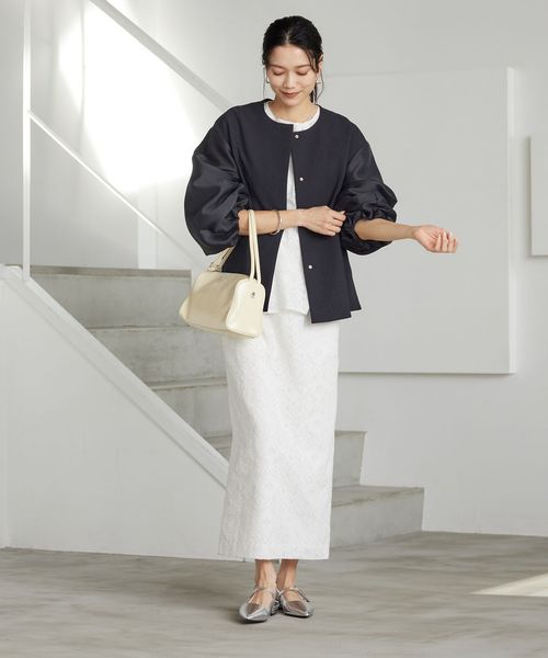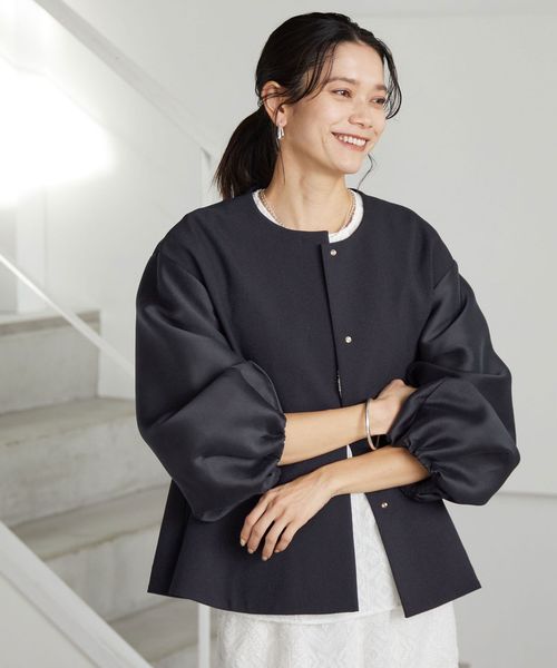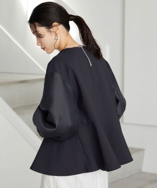 大胆なボリュームのある袖デザイン、身頃のペプラムシルエットが大人フェミニンな雰囲気。