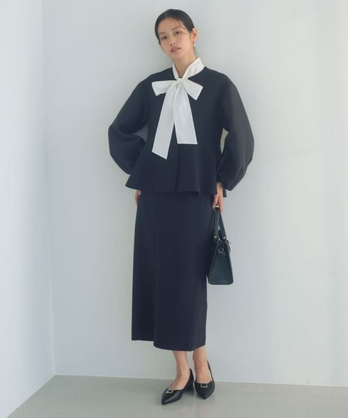 大胆なボリュームのある袖デザイン、身頃のペプラムシルエットが大人フェミニンな雰囲気。