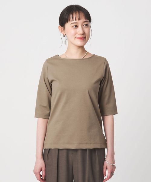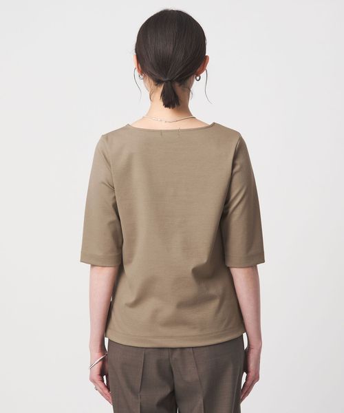 デコルテラインをキレイに見せてくれる浅めのボートネックデザイン。