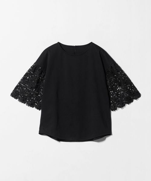 カットソー×袖レースの異素材コンビデザインが目を惹く一着。