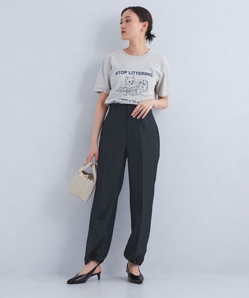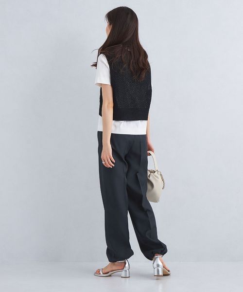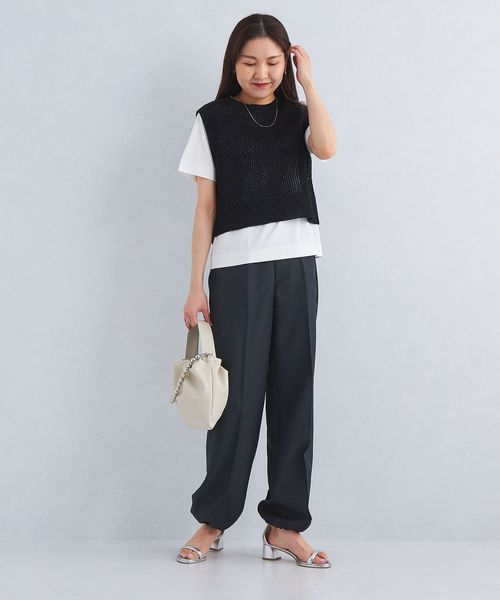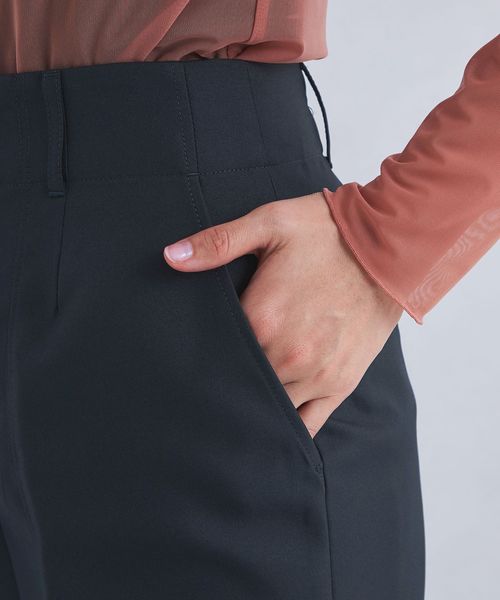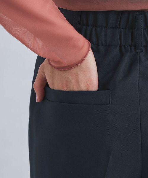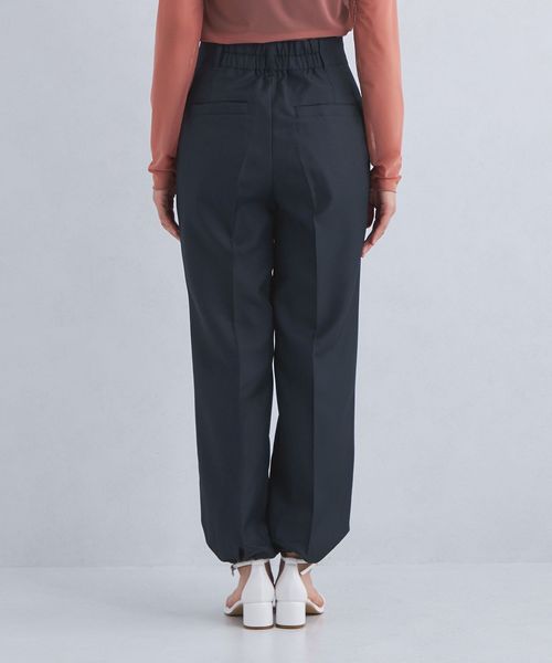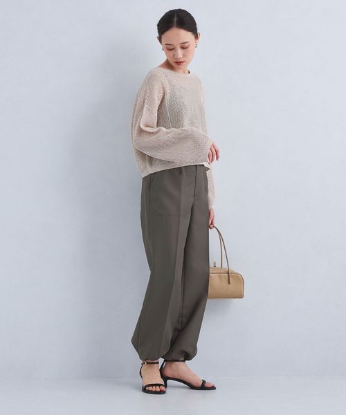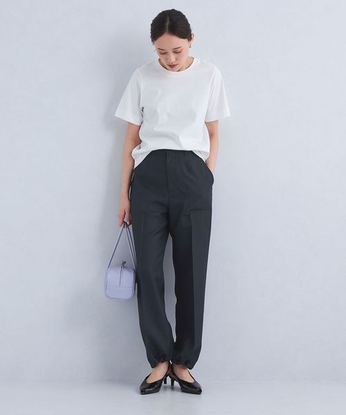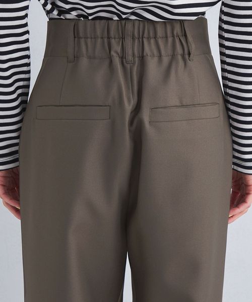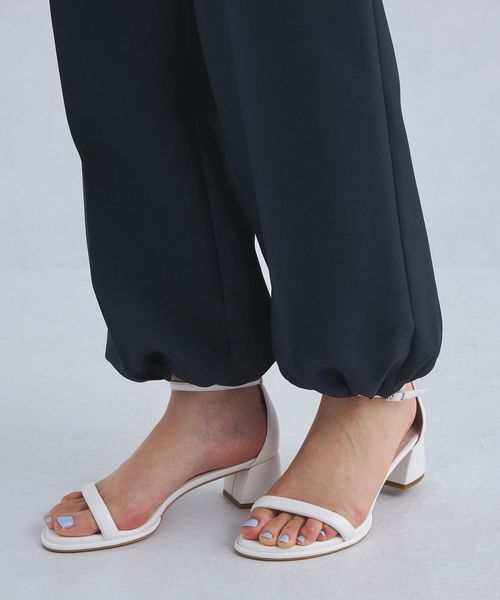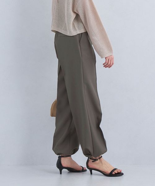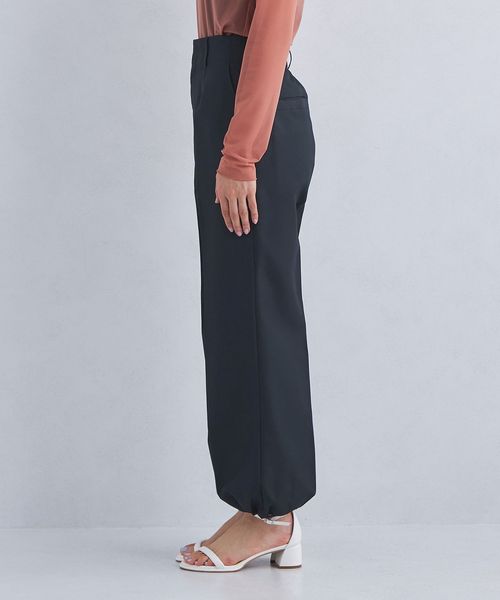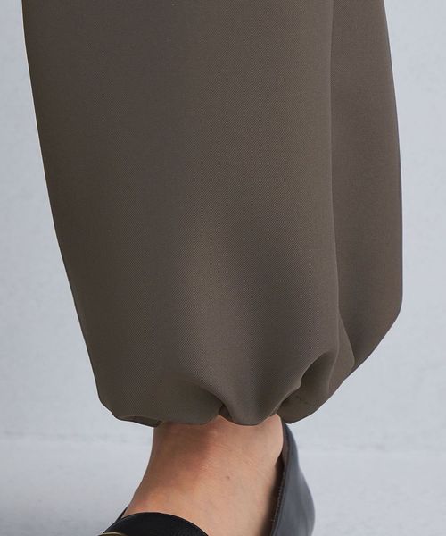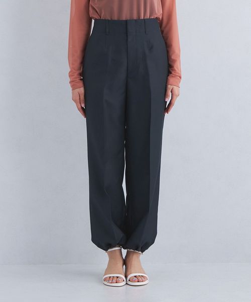 カジュアルな印象のベイカーパンツを女っぽく着用いただけるよう、微光沢感素材でお作りした一着。