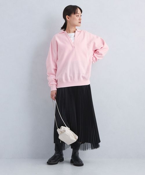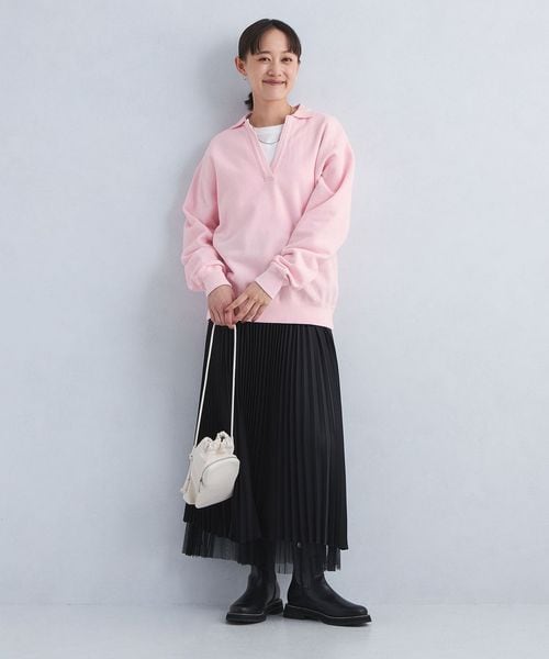 プリーツスカートと合わせたフェミニンなスタイルも◎