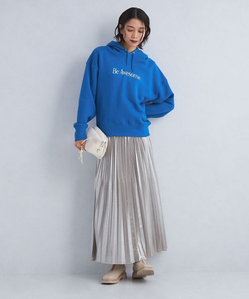 つや感のあるボトム合わせでトレンド感あるコーディネートが完成します。