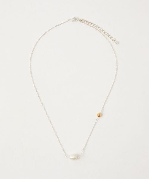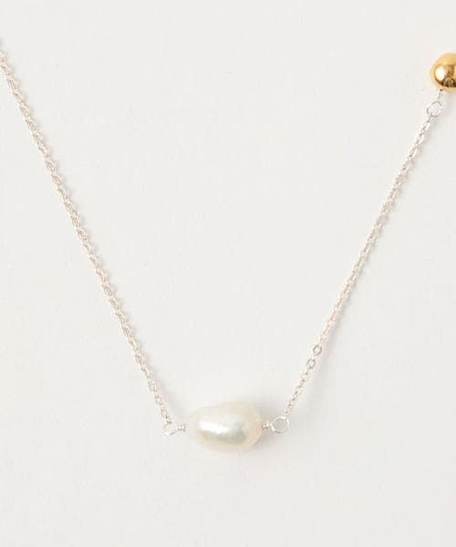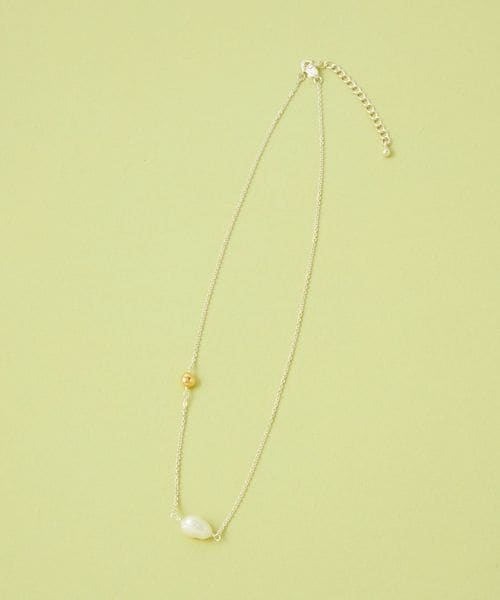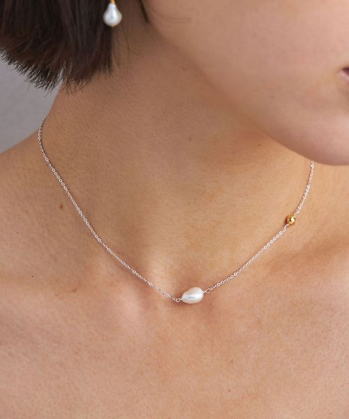 ショートタイプの淡水パールに、ゴールドカラーのメタルパーツのアクセントが映えるショートネックレス。