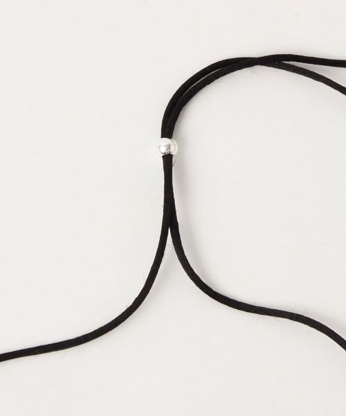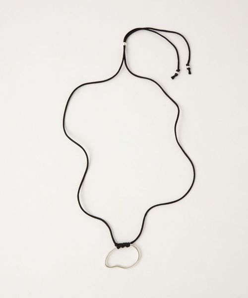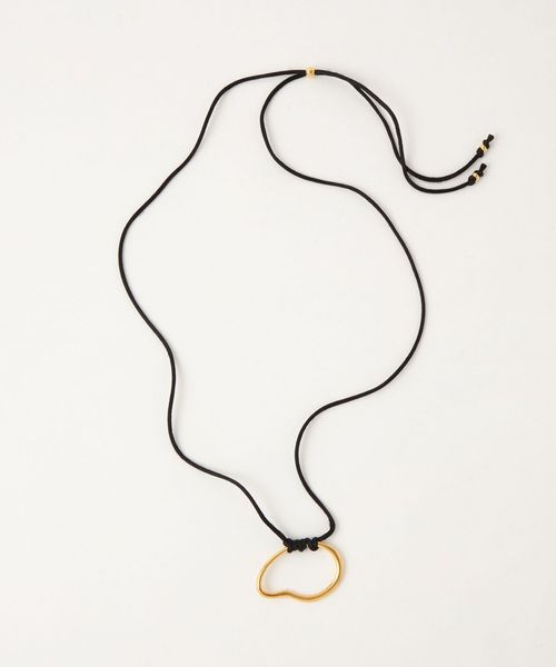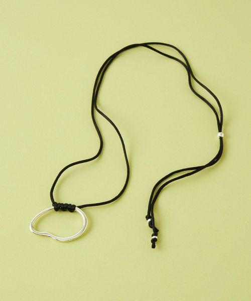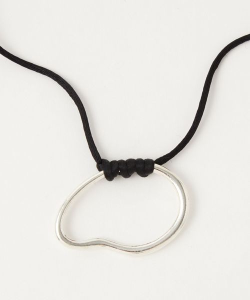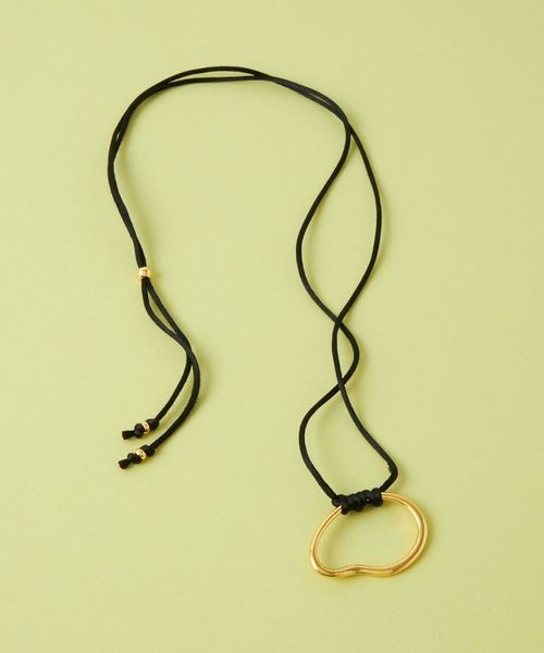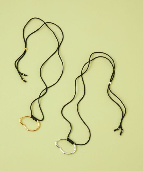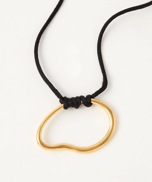 ニュアンスのあるサークル型のパーツにブラックのコードがついたトレンド感あるデザインのネックレス。