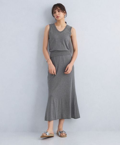 同素材のスカートと合わせたワンピース風の着こなしもおすすめです。