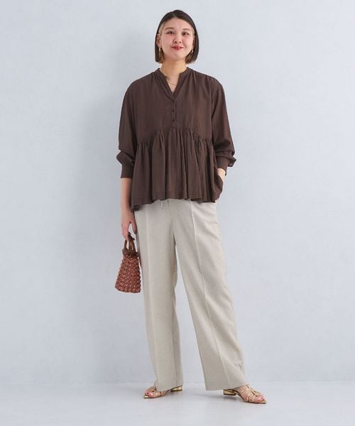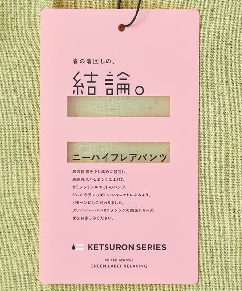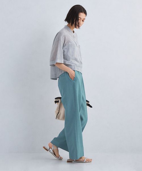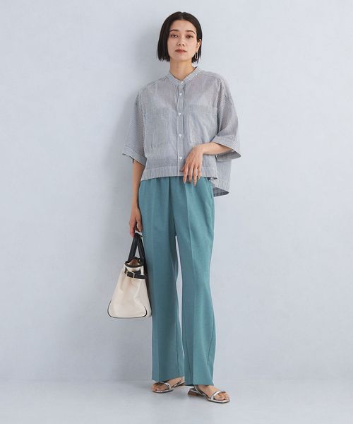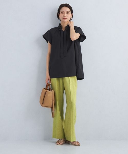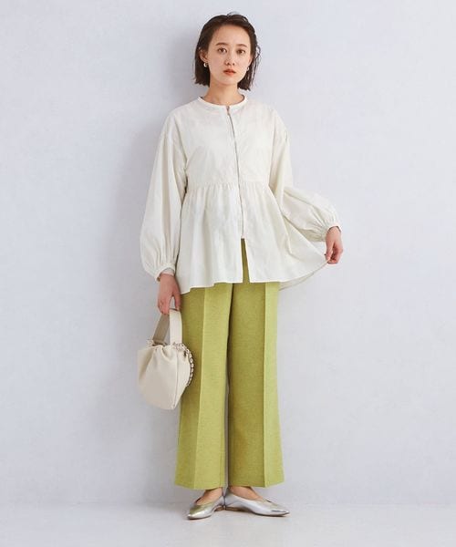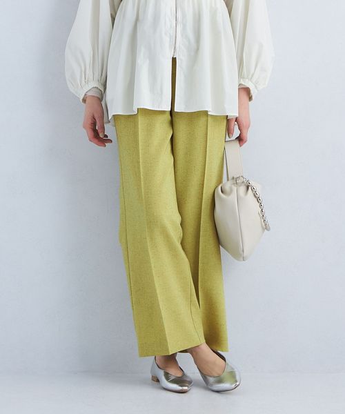 膝の位置を少し高めに設定し、すっきり見えするよう仕上げたセミフレアシルエットのパンツ。