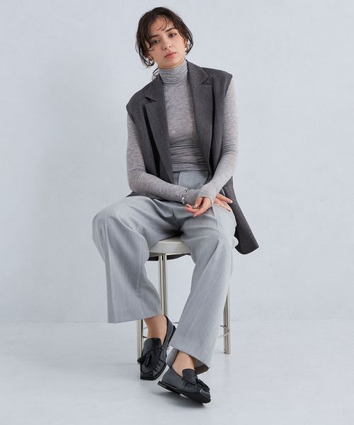 ワイドシルエットのパンツとのスタイリングがおすすめ。