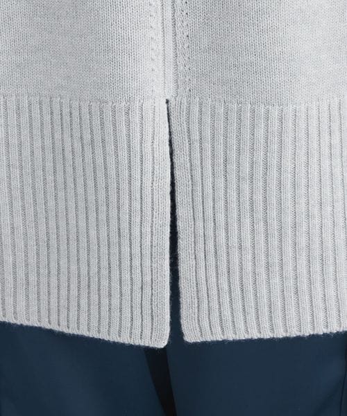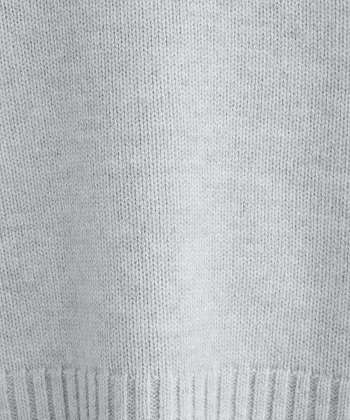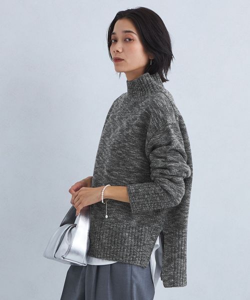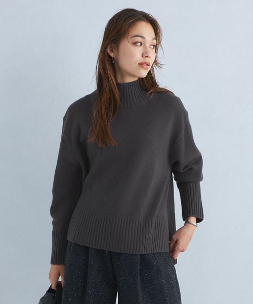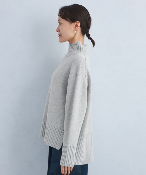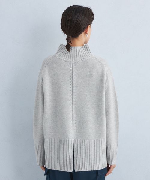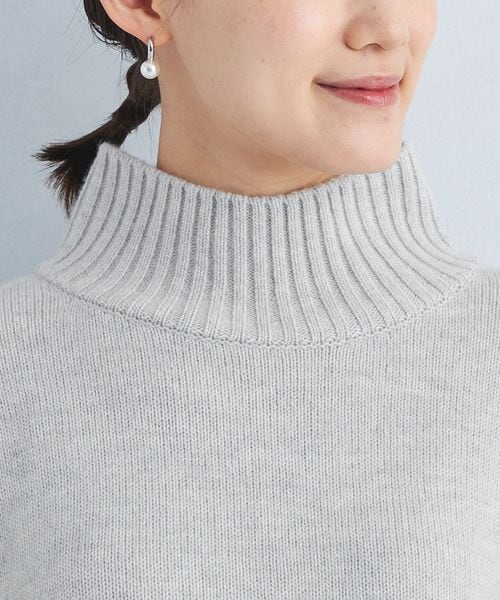 首から少し離れた立体的なハイネックデザインが特徴のニット。