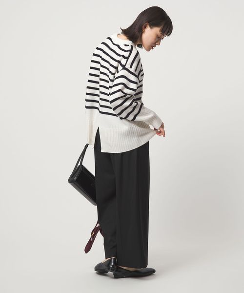 着丈に前後差をつけることで、スタイリングのバランスが取りやすいよう仕立てたクルーネックニット。