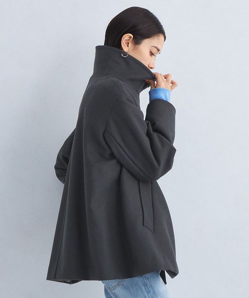 存在感のあるスタンドカラーデザインのミドル丈コート。