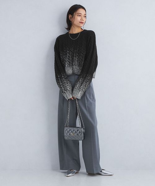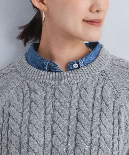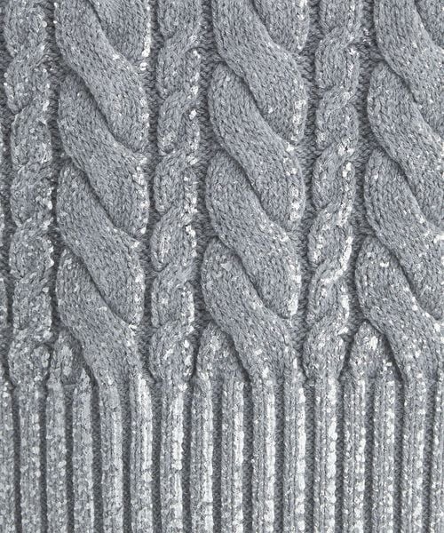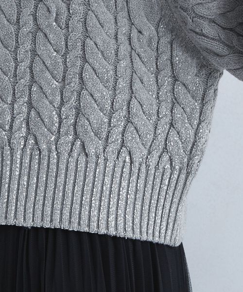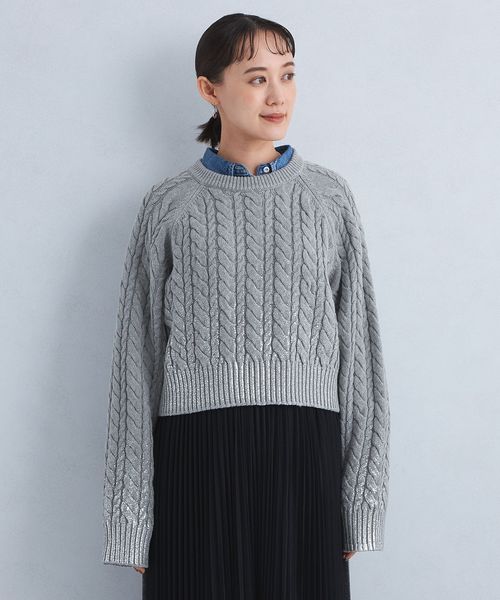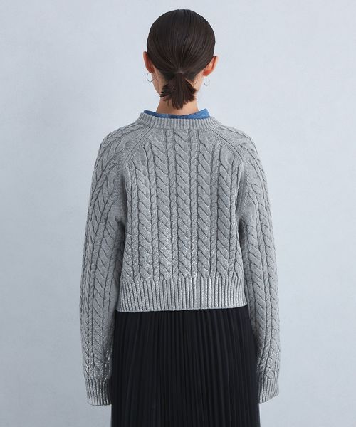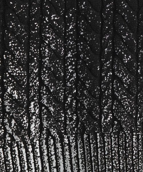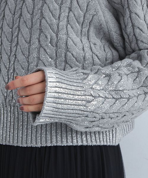 ケーブル柄の立体感ある編地に、箔プリントのシルバーが映える一着。