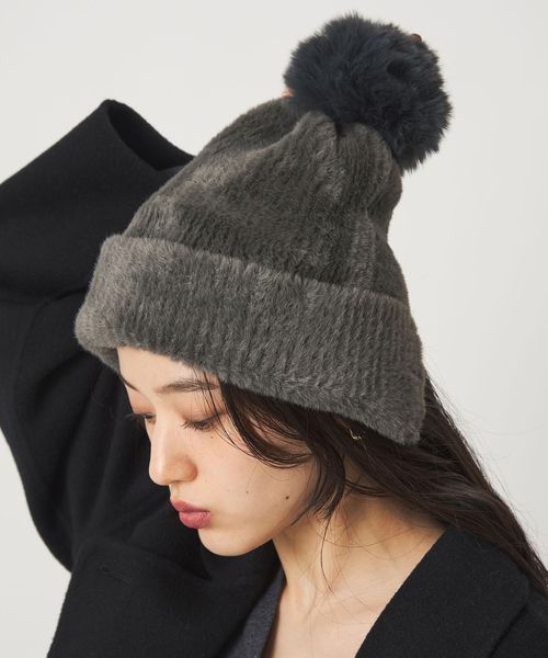 ベースのシャギーニットと、大きめのポンポンがポイントのニットキャップ。