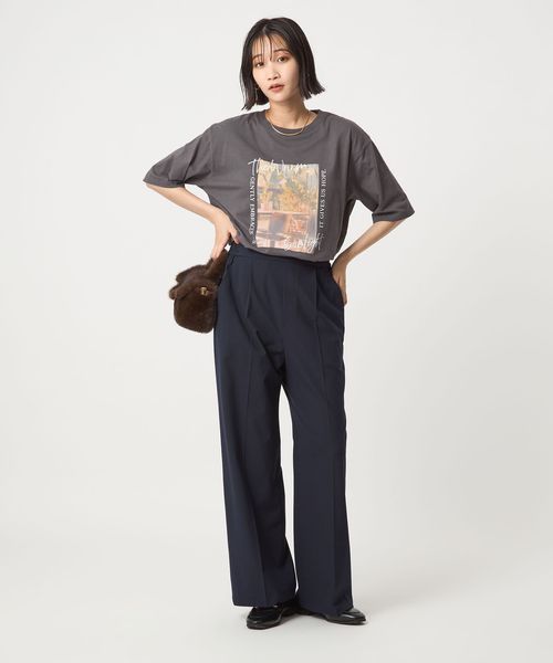 シックなカラーでまとめて、カラーのフォトプリントを目立たせた着こなしが◎