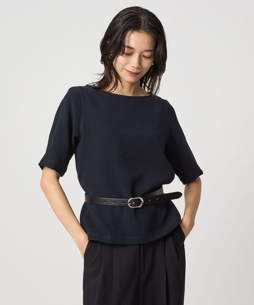 トップスの上をベルトマークする着こなしも、スタイリングのポイントに◎