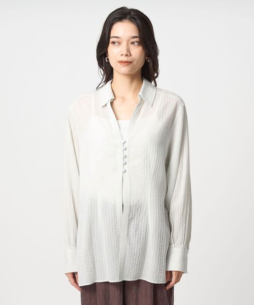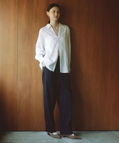 フロントは突き合わせにし、ボタンは中心に間隔をせばめて配置することで、裾の軽やかな抜け感が出るデザイン。