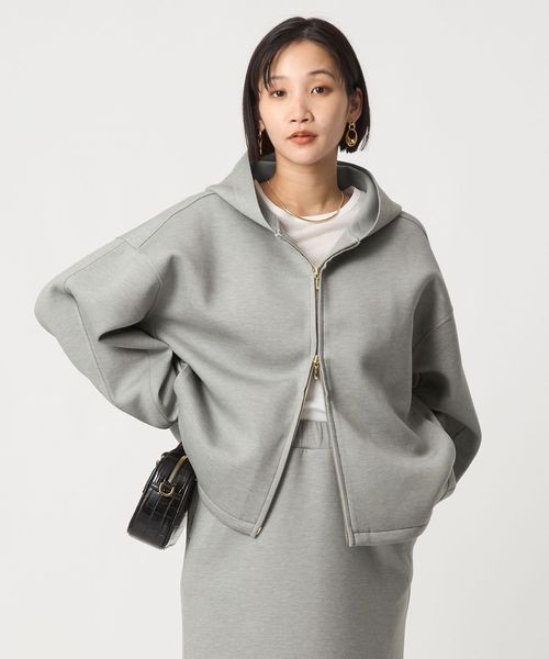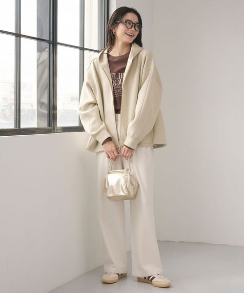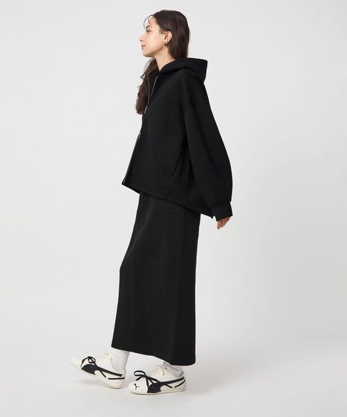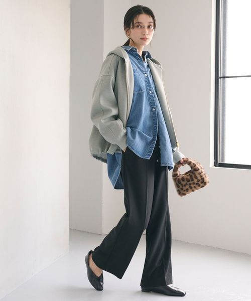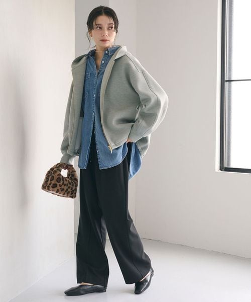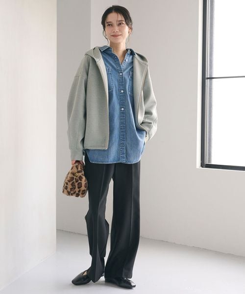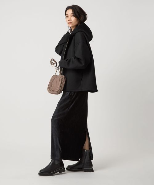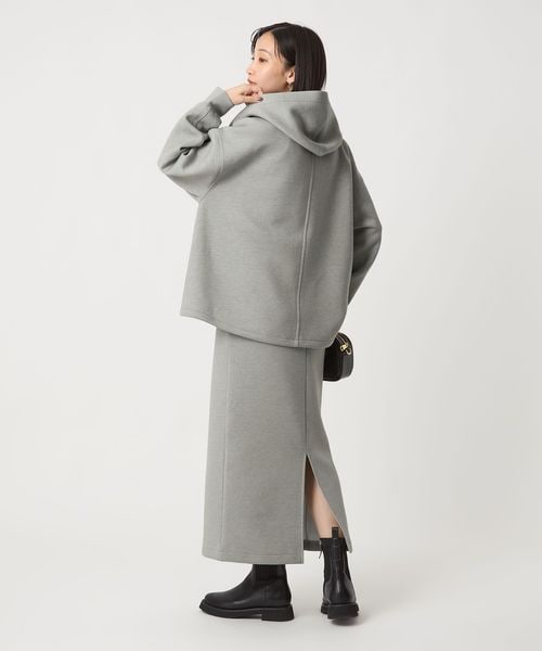 同素材のスカートと合わせたセットアップスタイルもおすすめです。