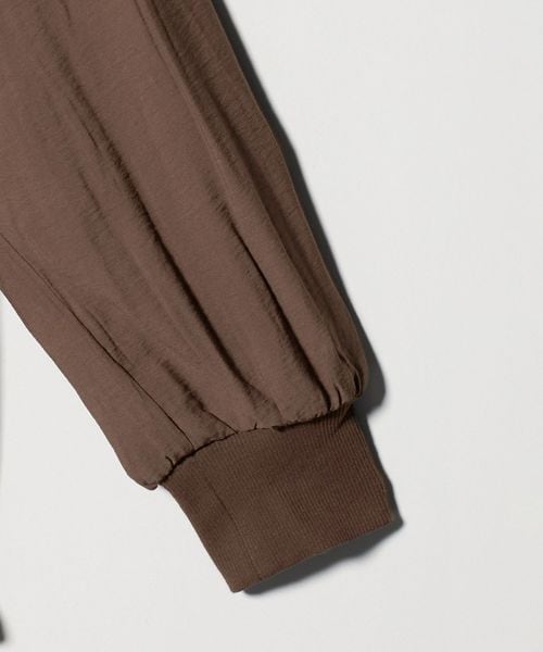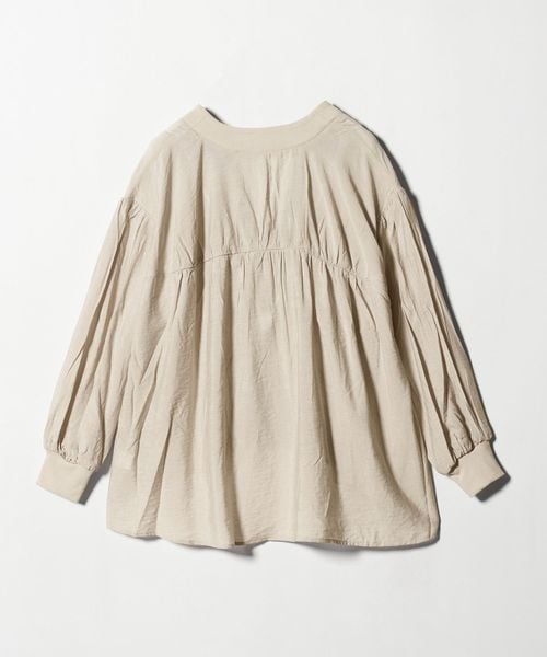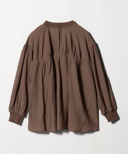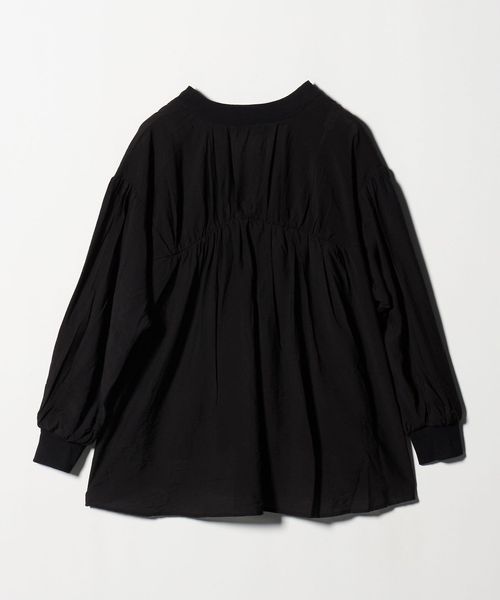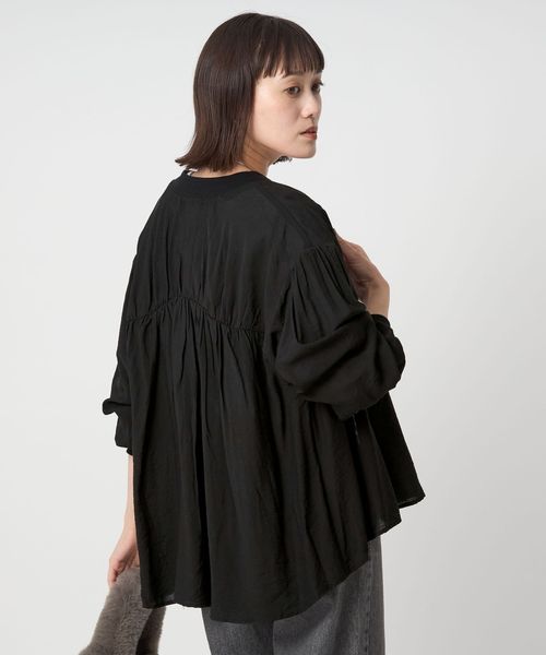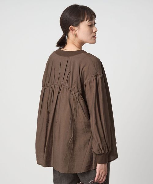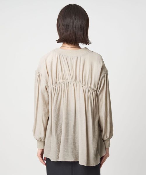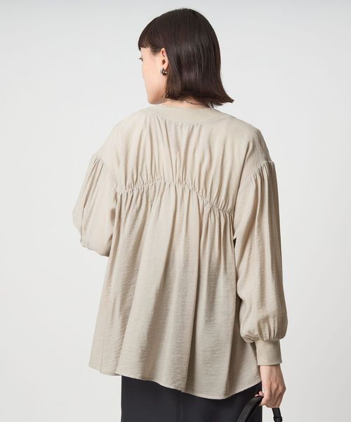 ショルダー部分やバックスタイルにギャザーを施すことで、立体感のあるシルエットに。