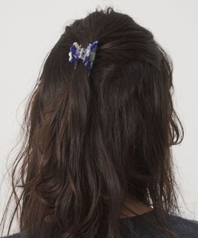 持ち手に特徴のあるスカラップデザインのついた大きめのヘアクリップ。
