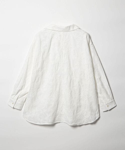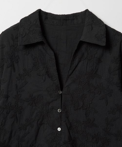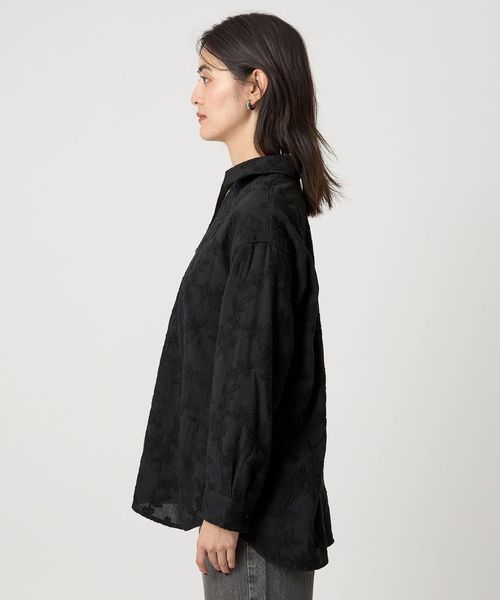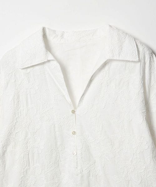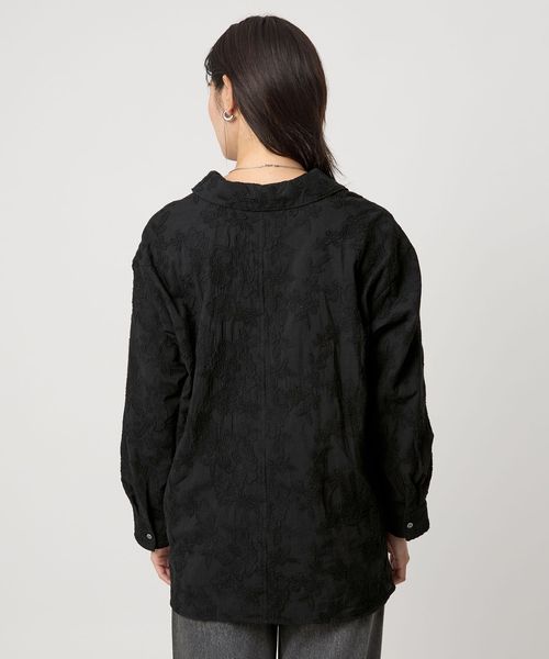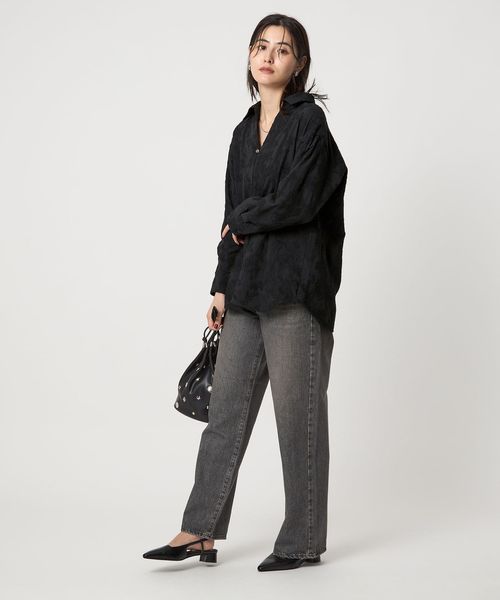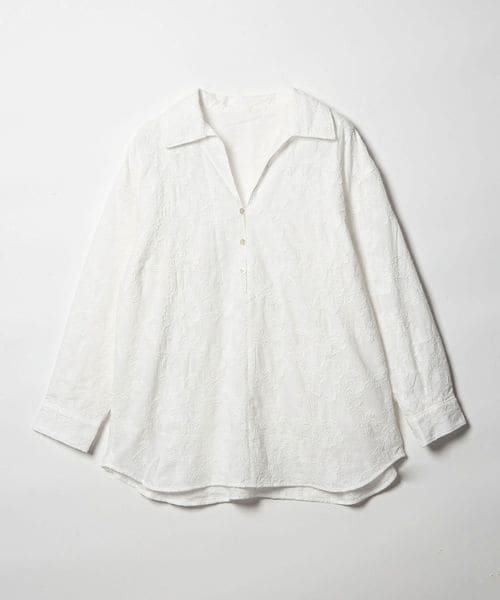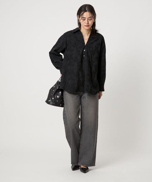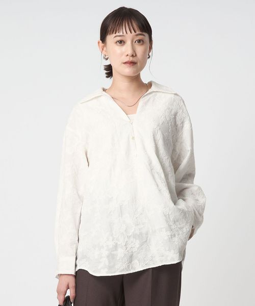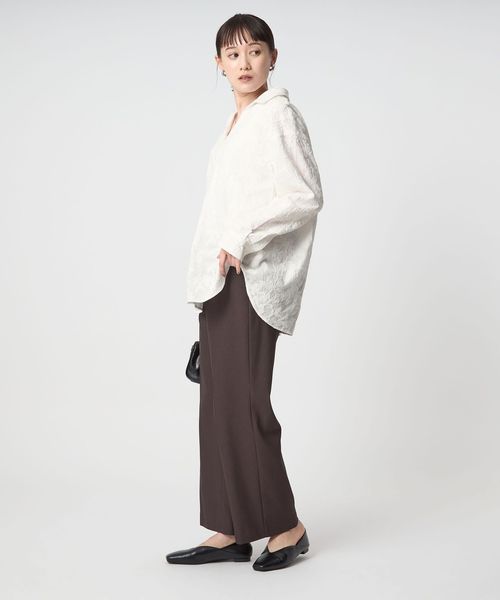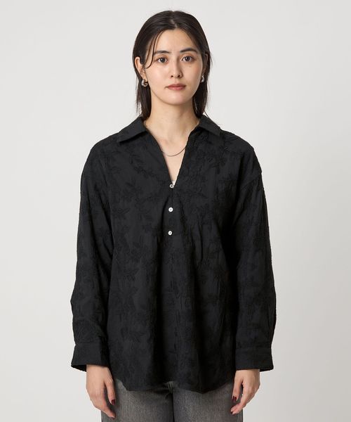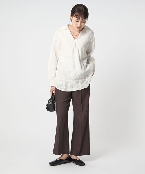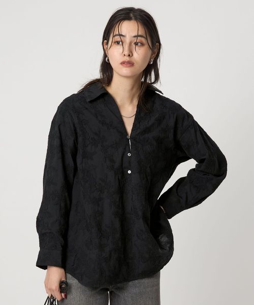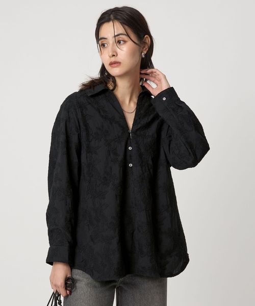 ジャガード素材に、シャープな印象のスキッパーデザインを組み合わせたブラウス。