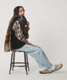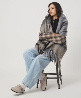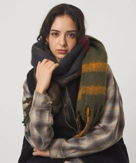 ふんわりと柔らかな素材と、大き目の柄がコーディネートのポイントになるマフラー。