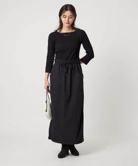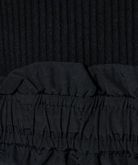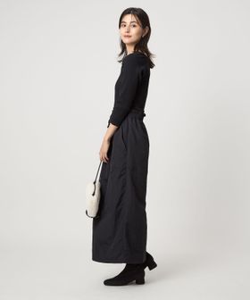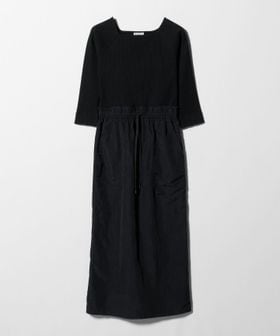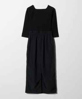 異素材ドッキング×ウエストのギャザーデザインが新鮮な印象の一着です。