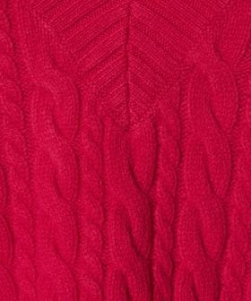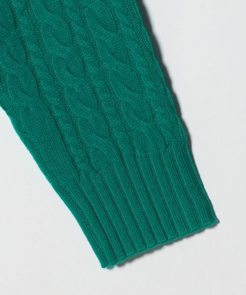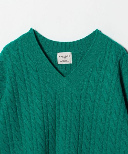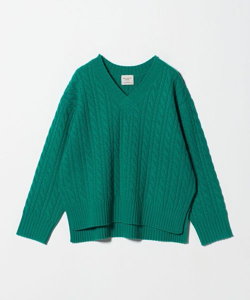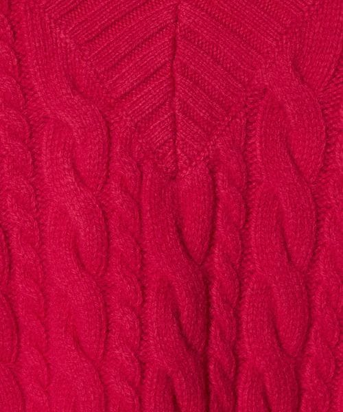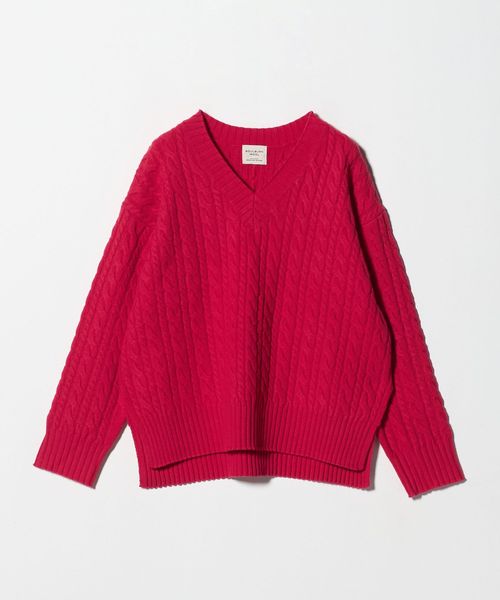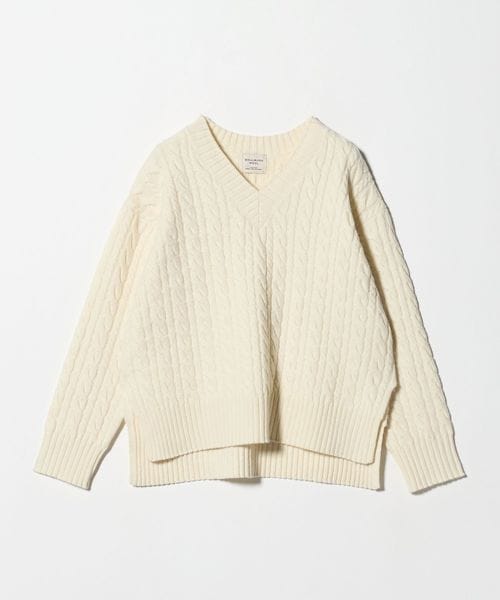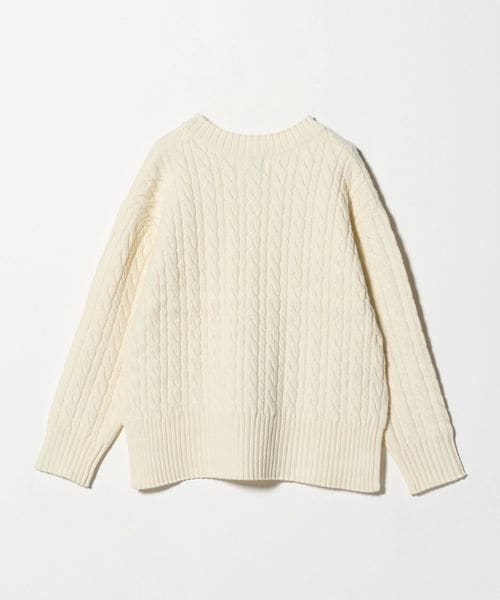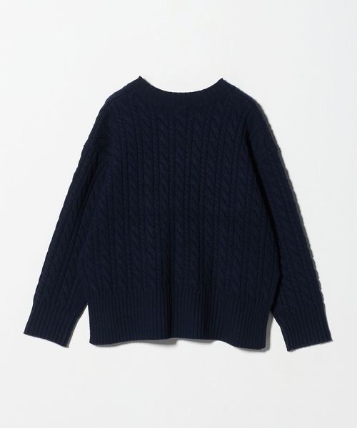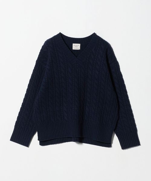 ふっくらとした素材感でアランケーブル柄がポイントのVネックニット。