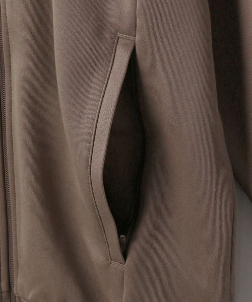 ネックや袖、裾を同色のリブ編み生地で切り替えた、すっきりとした印象のトラックジャケット。