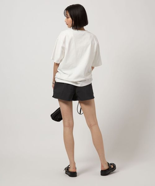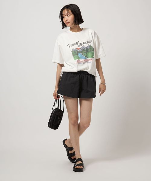 レジャーシーンでは、ロゴTシャツに足元をサンダル合わせが◎