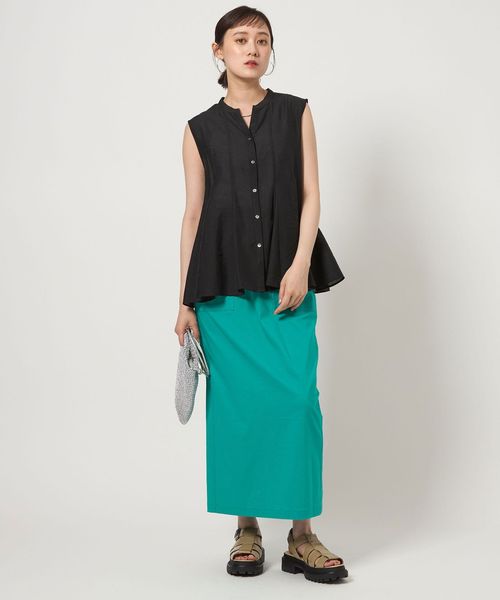 タイトスカートやテーパードパンツと合わせたすっきりとした着こなしがおすすめ。