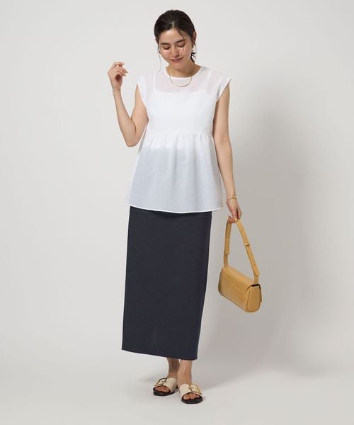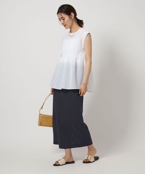 すっきりとしたシルエットなので、ペプラムトップスなどボリュームのあるアイテムとも好相性。