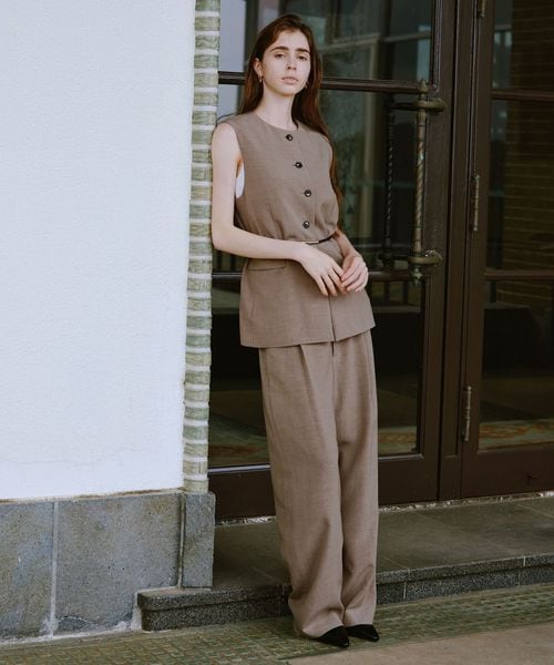 同素材のジレと合わせたセットアップスタイルもおすすめです。