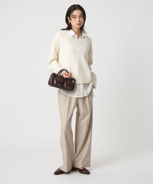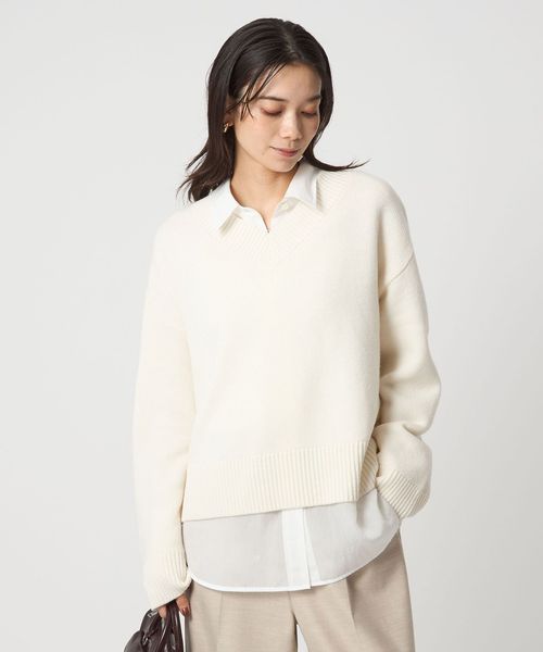 今シーズンはVネック×襟付きシャツのレイヤードスタイリングがおすすめです。
