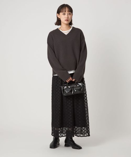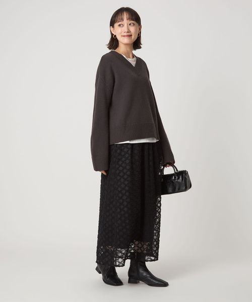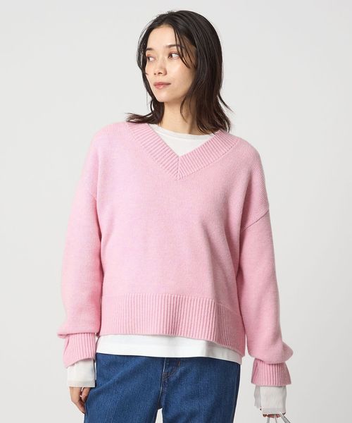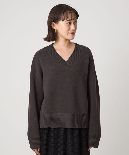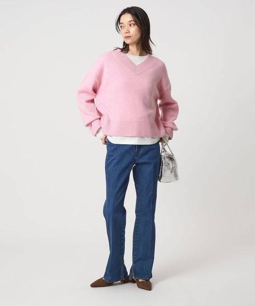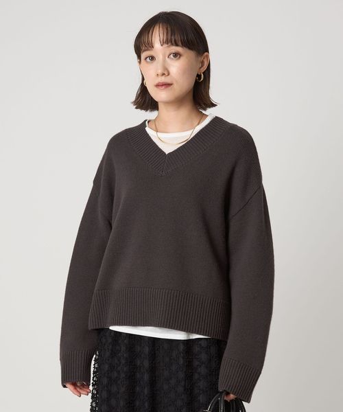 顔まわりをすっきり見せてくれるVネックが、旬な抜け感を演出。