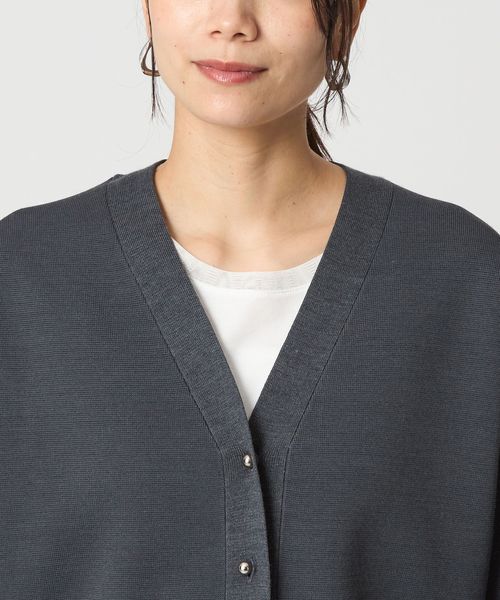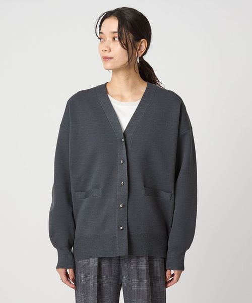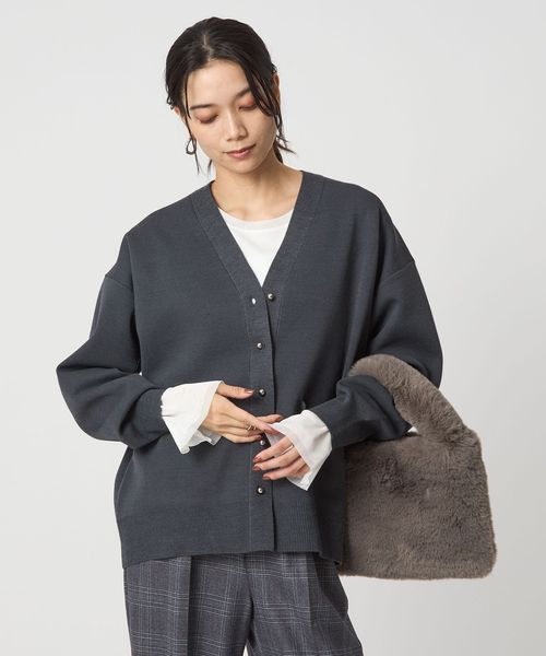 上品なメタル調ボタンがポイントのVネックカーディガン。