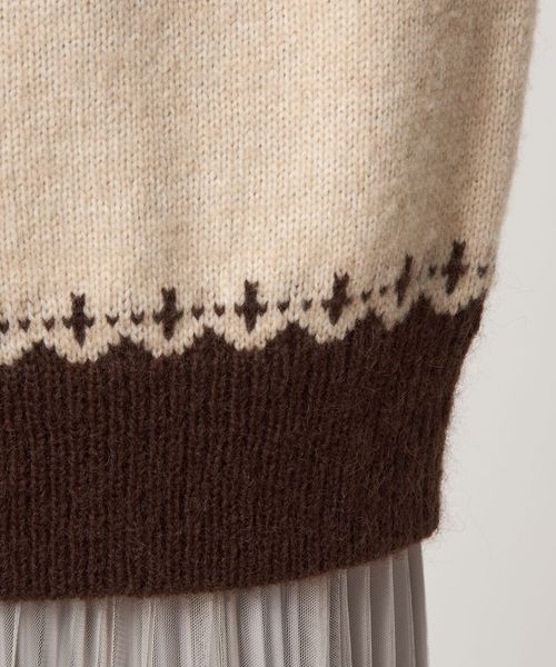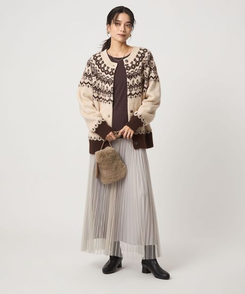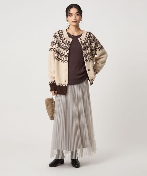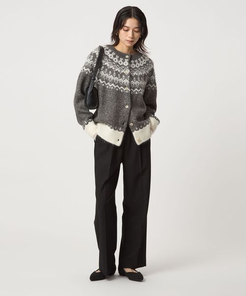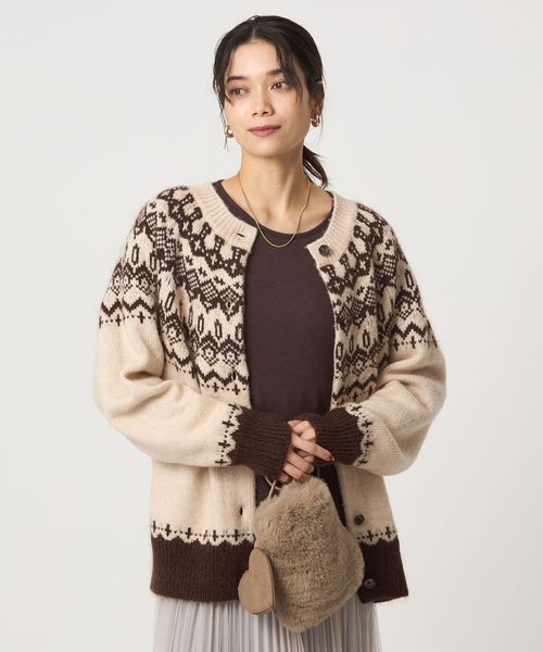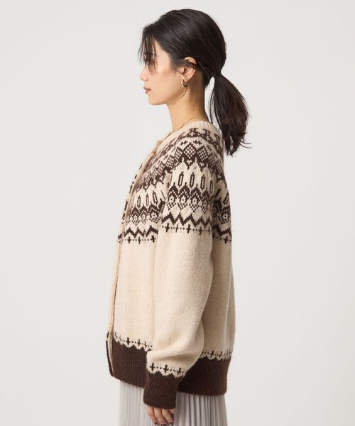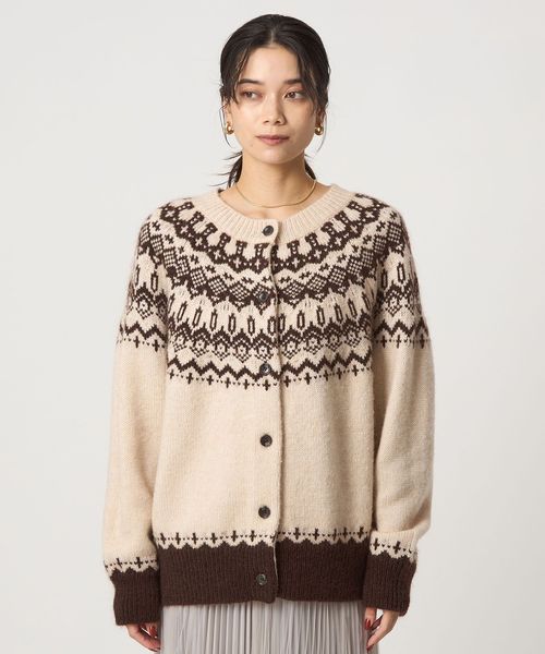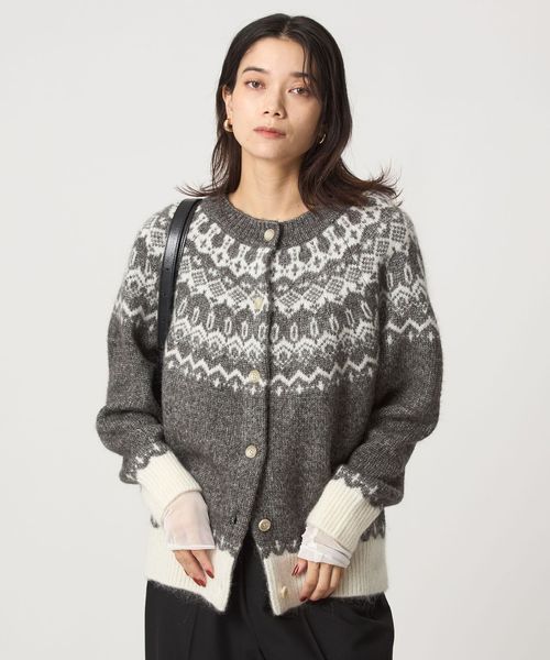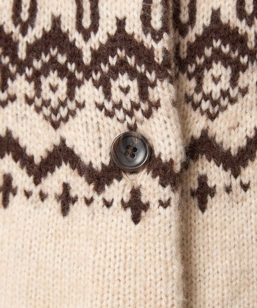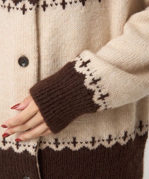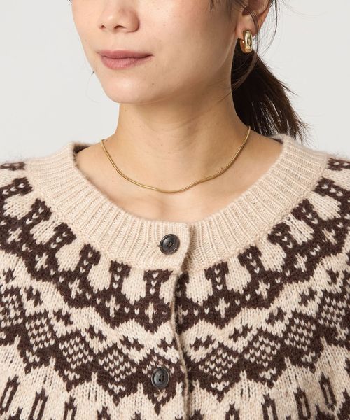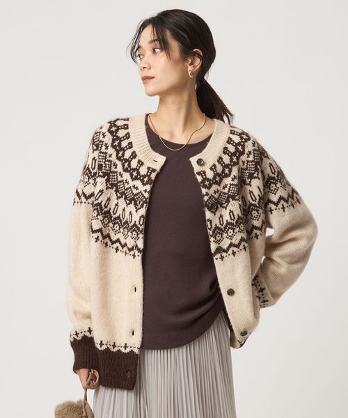 ベーシックカラーの組み合わせで表現された細やかな柄がポイントのニットカーディガン。