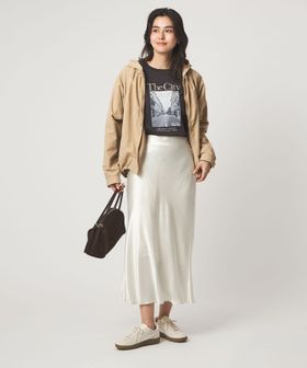 腰回りをカバーする丈感で、パンツでもスカートでも合わせやすい一着。